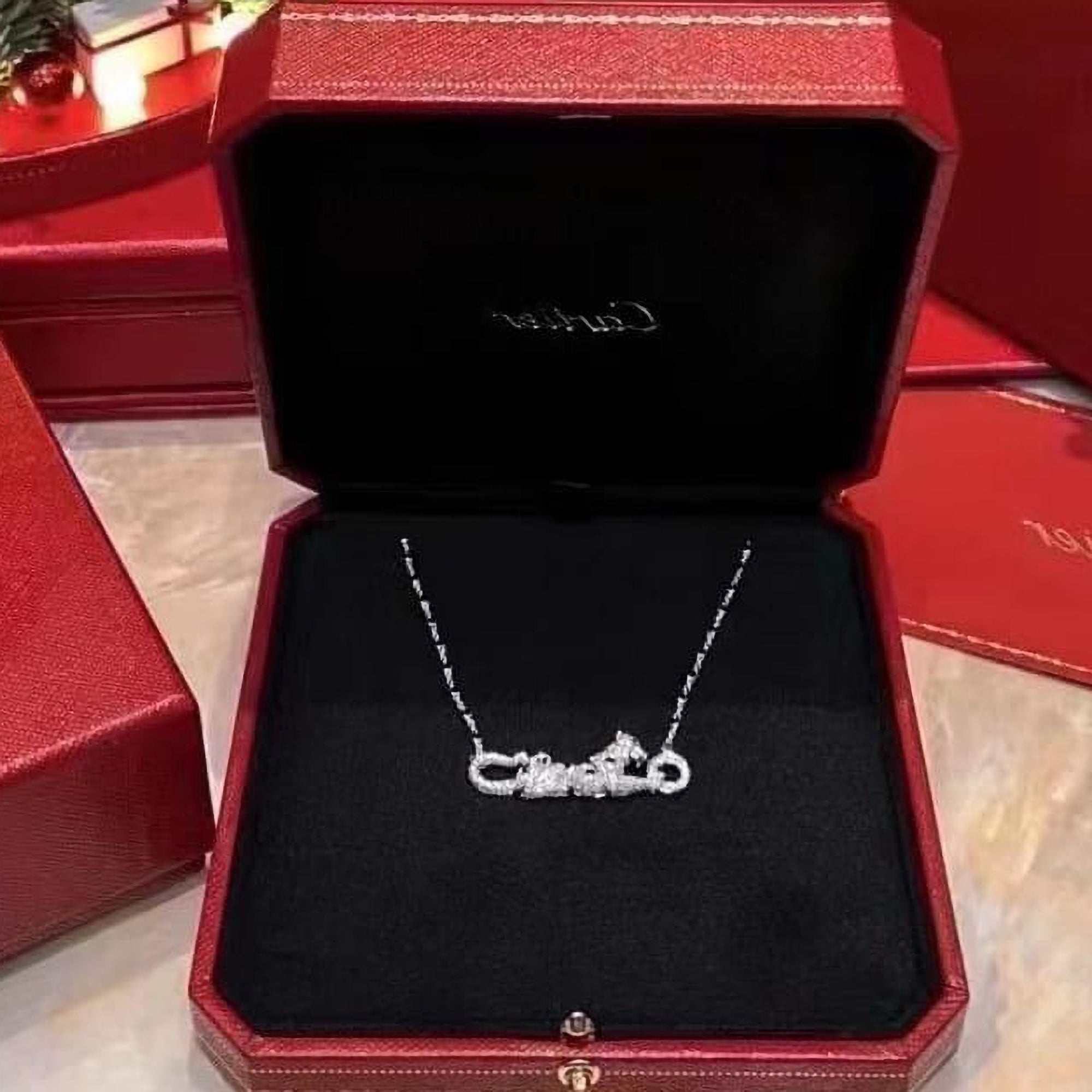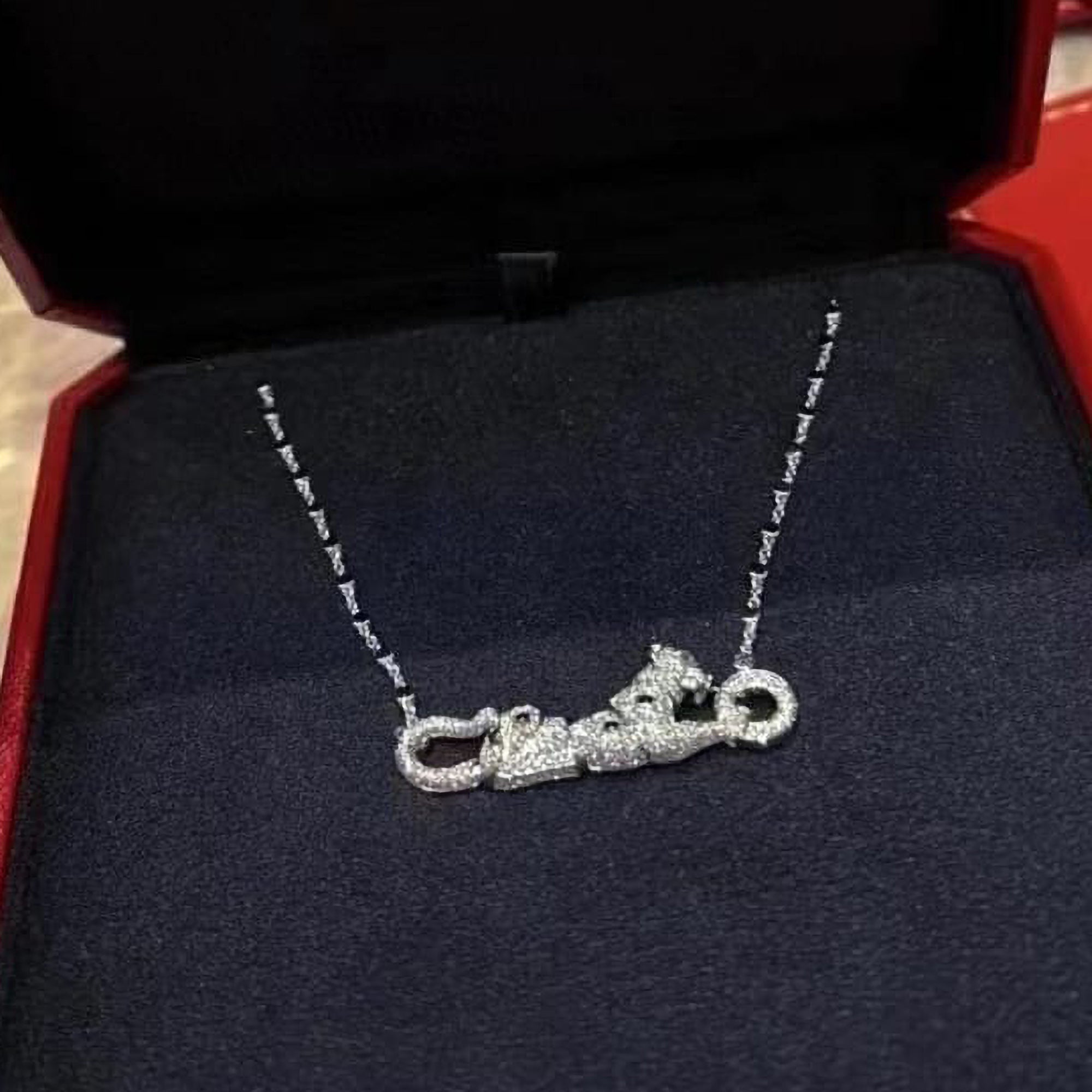 This striking Panther necklace is crafted in sleek white gold and accented with sparkling diamonds, creating a bold yet elegant statement piece. The panther motif symbolizes strength, confidence, and grace, making this necklace perfect for anyone who loves meaningful luxury jewelry.