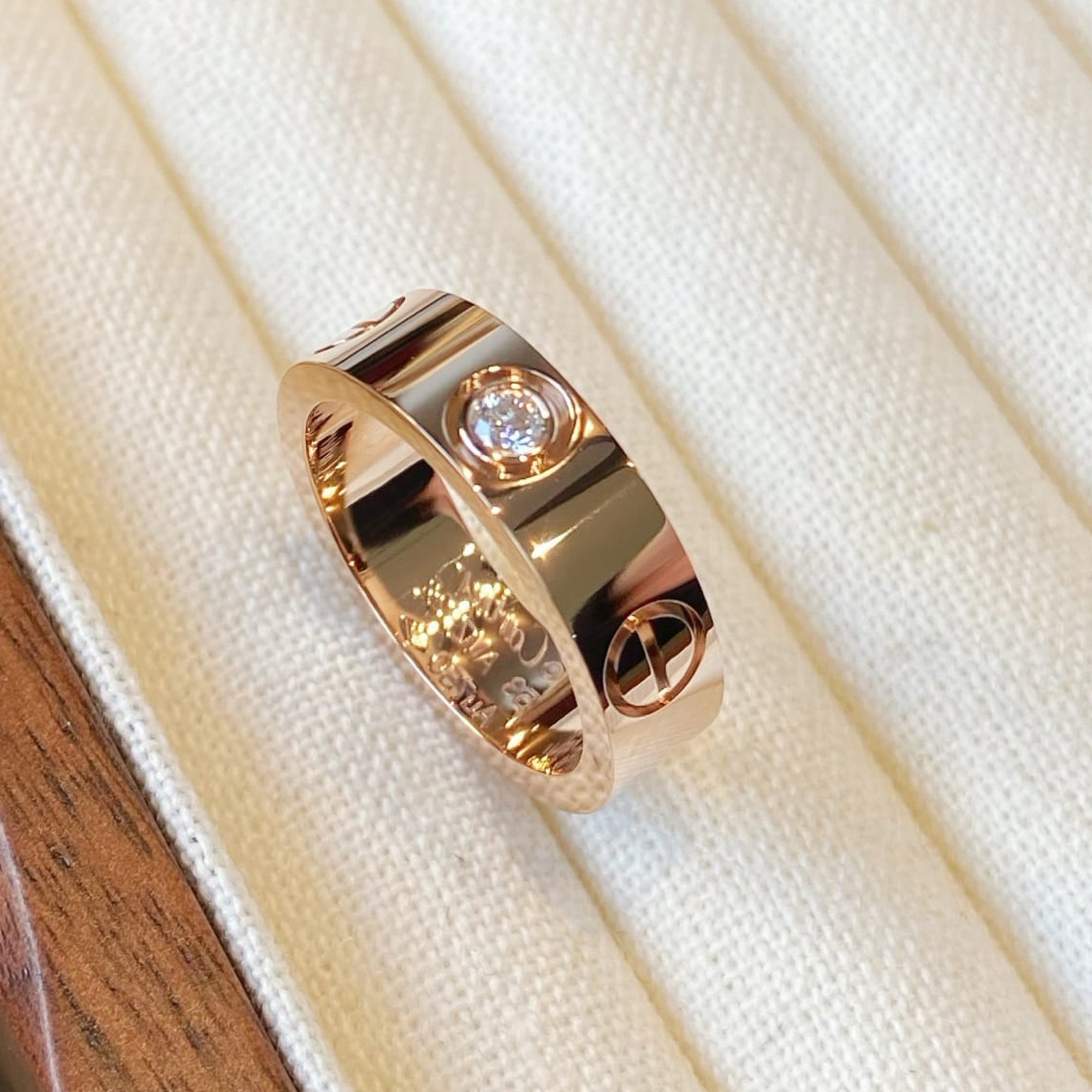 This refined Love ring is crafted in 18K rose gold and features the iconic screw motifs paired with a brilliant diamond, creating a timeless blend of symbolism and elegance. The warm blush tone of rose gold enhances the sparkle of the diamond, giving the ring a soft yet luxurious glow.